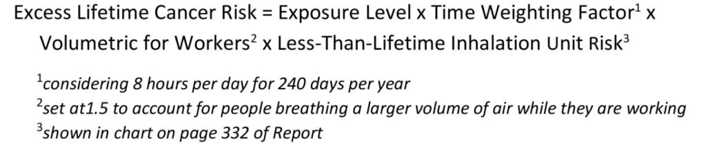 The EPA selected seven studies regarding exposures associated with asbestos-containing brakes (Blake et al. 2003; Cooper et al. 1987; Copper et al. 1988; Godbey et al. 1987; Madl et al. 2008; Sheehy et al. 1987a; and Sheehy et al. 1987b). Using these seven studies, the agency created a median value as the central tendency, short-term exposure level for workers performing brake work (0.006 f/cc). As Beckett, Miller, Peirce, and Finley pointed out during their presentation at 2021 DALS (Defense Asbestos Litigation Seminar), it is not clearly evident how the EPA derived this value of exposures. The EPA did not outline the steps they took to arrive at this number. The Agency defined the short-term exposure value to be that of the “central tendency” eight-hour time-weighted average (TWA) exposure for occupational brake work, assuming 40 brake jobs per week and 8 jobs per day. The EPA also looked at the “high end” eight-hour TWA exposure level, and the sample collected was for 103 minutes during arc grinding of drum brake shoes in both indoor and outdoor environments. In support of this “high end” eight-hour TWA, the EPA selected the highest short-term personal breathing zone result found in the seven studies. In its study, the EPA used this formula to calculate excess lifetime cancer risk: