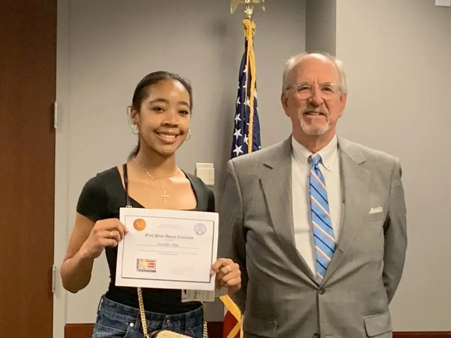 HeplerBroom attorney Glenn Davis (right) and Kendall Chism, first place winner of the Judicial Learning Center’s 2024 Law Day essay contest.